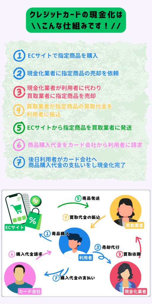 ただし各カード会社の利用規約に違反する行為となりますので、万が一現金化行為がカード会社にバレてしまうとカード利用停止などのペナルティを受けてしまう恐れがあります。