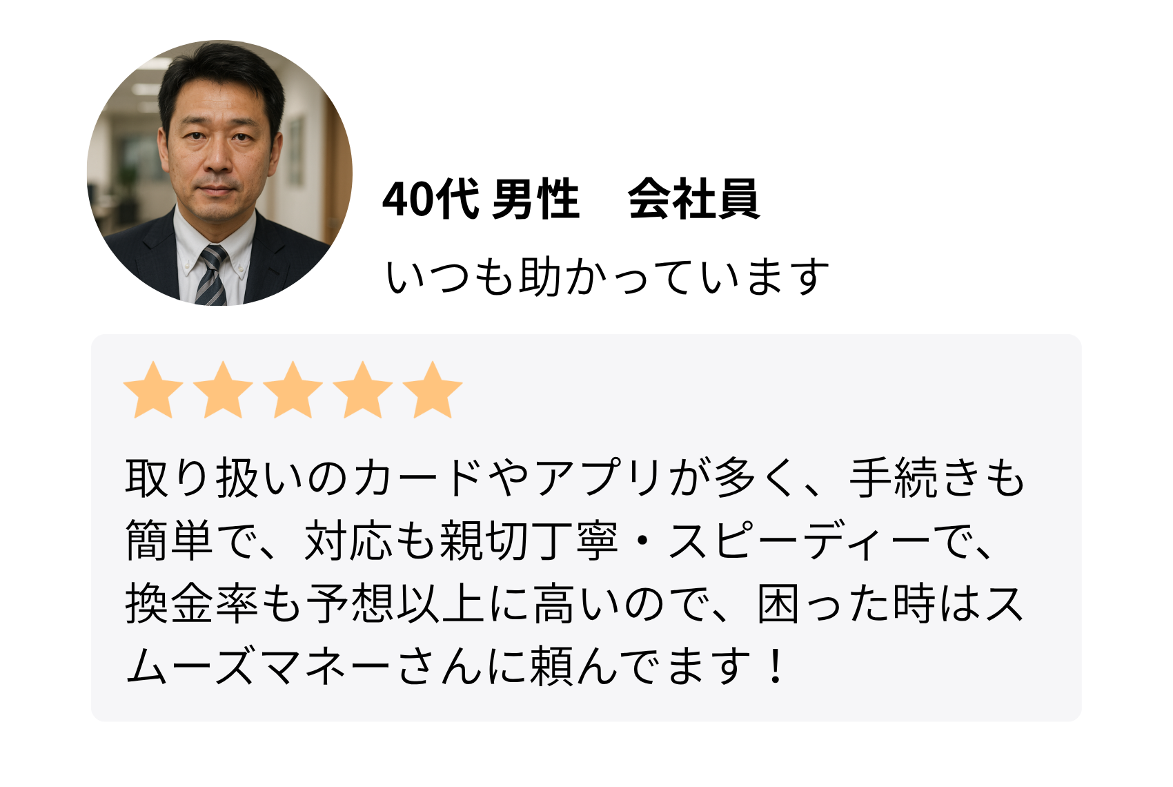 現金化業者ランキング第一位のスムーズマネーは、嘘偽りの無い高換金率で、安定のスピード感!